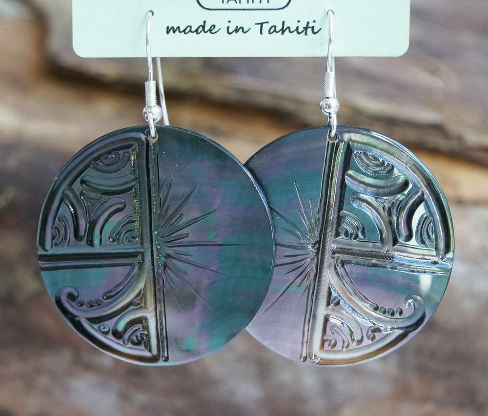 CouleurTropiques a sélectionné pour vous ces boucles d'oreilles en nacre de Tahiti et crochet argenté, gravées main d'un motif etnique.