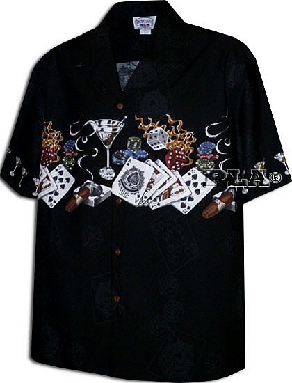 Tout l’univers du pocker, sur cette chemise hawaiienne, déclinée en rouille ou noir.
