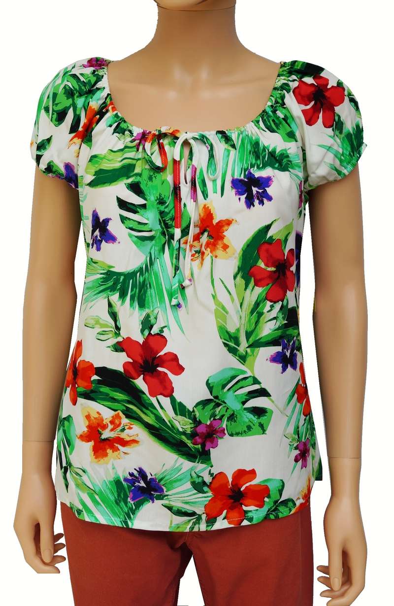 Joli chemiser hawaien avec petites manches élastiquées. A porter soit autour du cou, soit épaules découvertes! Sur fond crème, avec fleurs d'hibiscus de differents couleurs. L'authentique chemisier à fleurs.