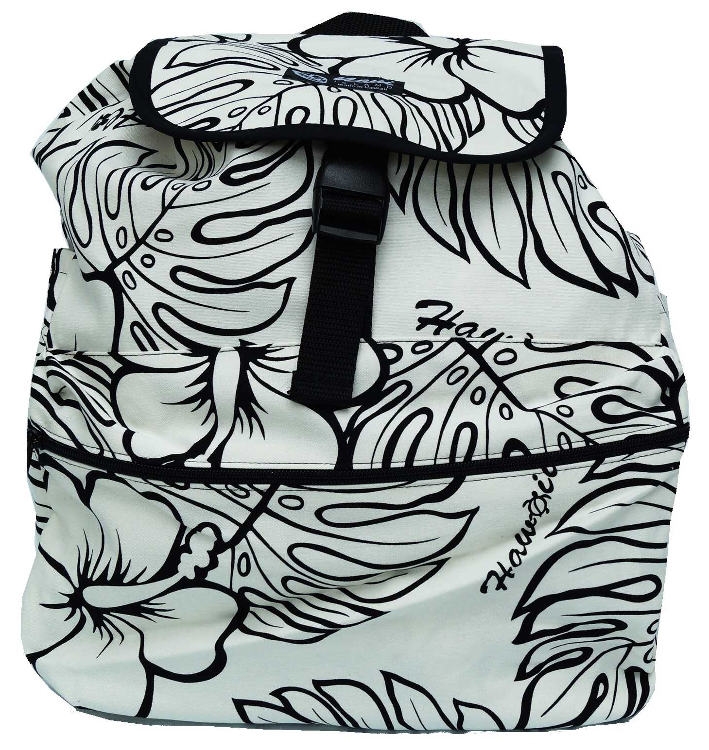 Un sac à dos fabriqué à Hawai par Nany Island Hawaï. Des fleurs d'hibiscus accompagnées de feuilles de monstera se détachent sur un fond clair. Toute la sobriété et la magie de l'archipel Hawaïen pour ce sac à dos qui se la joue très féminin. Chez CouleurTropiques, la gente féminine a craqué.